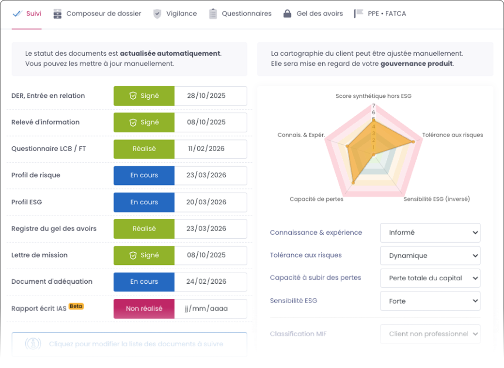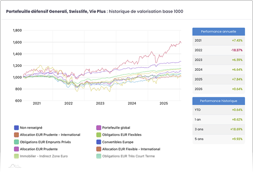 Accédez à une vue claire et structurée de l’ensemble des encours de vos clients. Analysez la performance des supports, les plus et moins-values latentes, les équilibres d’allocation ainsi que le risque et la volatilité de leurs contrats. Arbitrez en toute confiance grâce à une vision factuelle et opposable.